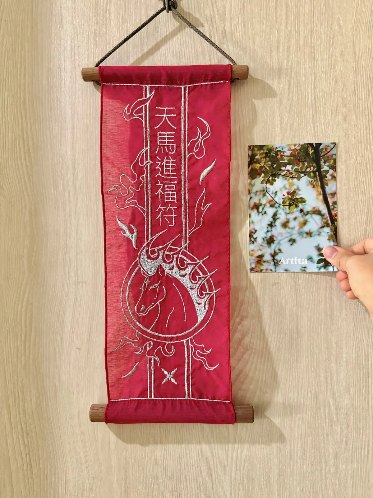 집을 오가고, 방을 드나드는 순간의 공기가 변했어요.아티타(Artita) 노방자수족자 〈천마진복부(天馬進福符)〉를 걸어두고 나서부터 집 안 공기가 더욱 따뜻하고 힘찬 에너지로 채워지는 것 같아요.붉은 색감이 공간에 온기가 생기고, 얇게 비치는 노방 위로 은은한 은사 자수 덕분에 문양들이 조용히 살아나요.‘天馬進福符’는 '하늘의 말이 복을 데려오는 부적'이라는 뜻이라, 마음이 든든해져요. 성공과 지혜를 소망하는 저에게 더없이 알맞는 오브제네요. 집들이나 이사 기념, 외국인에게 실내 인테리어용으로 선물하기 참 좋은 것 같아요. 소중한 공간에 한국적인 미감과 좋은 의미를 한아름 채워보시기 바래요.
