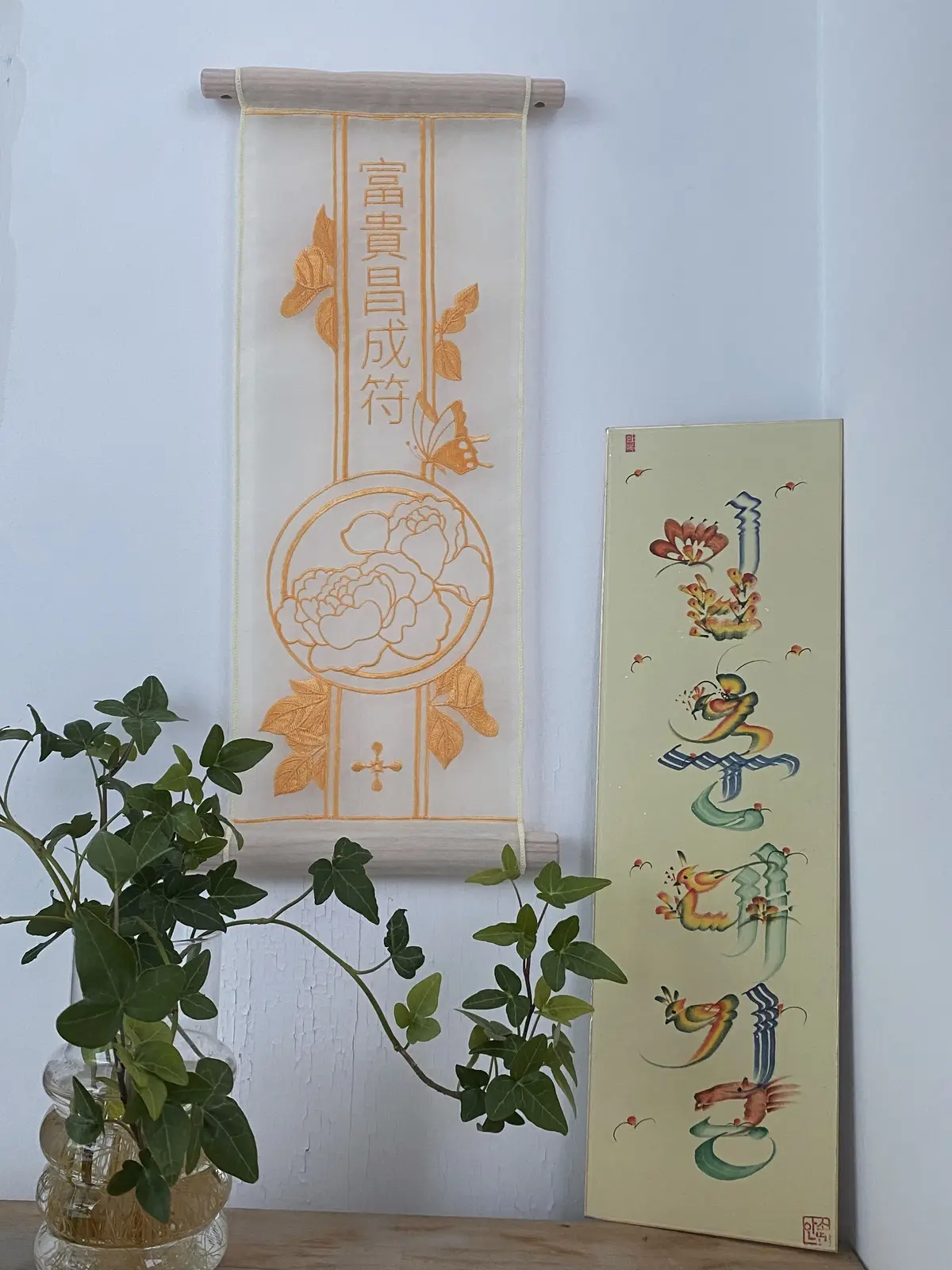 .부귀창성부(富貴昌成符) 재산이 많고 지휘가 높으며 기세가 크게 일어나 이루고자 하는 것을 이룰 수 있는 부적이라니!!! 여기저기 대보다가 굘국 고2 아들 방에 잘 걸어두었습니다. ^^ 봄빛과 잘 어울리는 고운 노랑 빛에부와 명예를 상징하는 모란꽃이 수놓아져그림자까지 예쁘게 드리워져서칙칙하던 아들 방이 확 살아나는 것 같았어요. 인테리어 소품으로도, 부적으로도 (십자가랑 같이 놓는 센스 🤭),외국 친구들에게나 집들이 선물로 너무 딱 맞는 아이템인 것 같아오. 요즘은 케이컬쳐가 대세니까요 💛